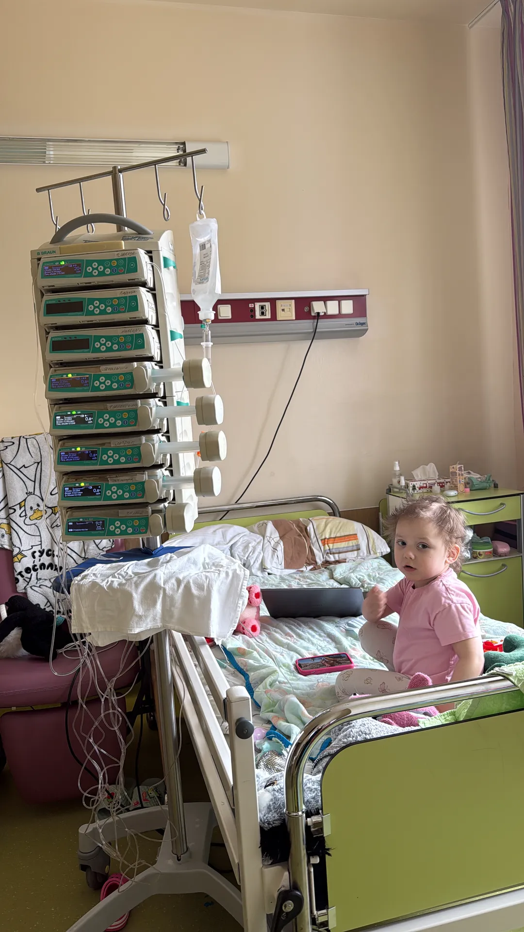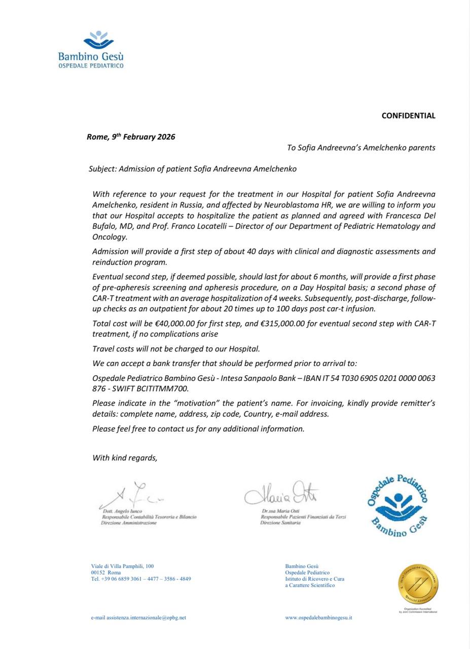 Мы, папа и мама Софии, Андрей и Анастасия, так ждали появления нашей девочки. Когда родился сын Миша, мы знали, что хотим подарить ему сестренку. И вот, в августе 2022 года, к нам пришло самое большое чудо — наша София. Яркая, улыбчивая девчонка с серьезными глазками. Она наполнила наш дом теплым светом и этой особой нежностью, которую приносят с собой только дочки. Первые два года жизни были непростыми, но очень насыщенными. Мы строили планы и осуществляли их, путешествовали вместе, мечтали о большем, мы были по-настоящему счастливы в нашем маленьком мирке. Всё изменилось, когда Софии исполнилось два года. Летом 2024 года на следующий день после того, как мы отпраздновали Софушкин день рождения, у нее заболели ножки. Сначала думали, что просто устала, потом — что последствия перенесенной инфекции. Мы пробовали справиться с этой ситуацией самостоятельно, обращались к специалистам, предполагали постинфекционный артрит, лечились с временным улучшением, надеялись, что пройдет, но глубоко в душе сидел какой-то страх, который не давал покоя. Наша веселая, непоседливая девочка стала угасать на глазах. Она перестала бегать, потом — с трудом ходила, прихрамывая и плача. Она похудела на полтора килограмма — для ее крошечного тельца это была катастрофа. Сердце сжималось от страха. Каждый день приносил новую тревогу: В очередной раз сдали кровь, очень снизился гемоглобин и запредельно вырос С-реактивный белок. Начался самый страшный месяц в нашей жизни. Каждый день — как хождение по лезвию. Каждый разговор с лечащим врачом — новый удар. Госпитализация с подозрением на остеомиелит, бесконечные исследования, пока София лежала слабая и беззащитная. Потом — операция на бедре, биопсия. И после нее — кошмар. Постоянные переливания крови, чтобы поддержать ее силы. Гипсовая лонгета, которая не давала ей двигаться. Наша малышка не могла ни сидеть, ни стоять, ни даже удобно лежать. Она просто лежала и смотрела на нас своими огромными глазами, и в них мы читали вопрос: «Мама, папа, что со мной?» А дальше страшные слова, которые никогда не должен слышать родитель о своем ребенке. Новообразование, пока неизвестно какого генеза, подозрение на его злокачественность, нейробластома, метастазы, 4 стадия, группа высокого риска. Мир рухнул. После 2 блоков химиотерапии в онкогематологическом отделении г. Красноярска в ноябре 2024 года мы приехали продолжить лечение в НМИЦ ДГОИ имени Дмитрия Рогачева, где по сей день мы с Софией находимся. Дальше была борьба. Бесконечная, изматывающая, но за нашу девочку. Шесть курсов химиотерапии, на которые она, наше двухлетнее чудо, отвечала с недетской стойкостью. Операция, удалившая основную опухоль. Высокодозная химия, трансплантация стволовых клеток, лучевая терапия, иммунотерапия. Мы видели, как тяжело нашей девочке дается этот путь. Потеря веса, регулярная тошнота и рвота, боли и восстановление после операции. Но мы видели и другое! Видели, как после первых курсов опухоль сократилась на 96%. Как наша ослабленная девочка улыбалась и стойко шла вперед. Как училась заново вставать после того, как сняли гипс. Как задорно играла с другими ребятишками в отделении и обрела первых настоящих друзей. Мы поверили, что чудо возможно, и мы побеждаем. После 3 блока иммунотерапии оставалось всего ничего, мы вернулись домой и за 3 недели в перерыве меж