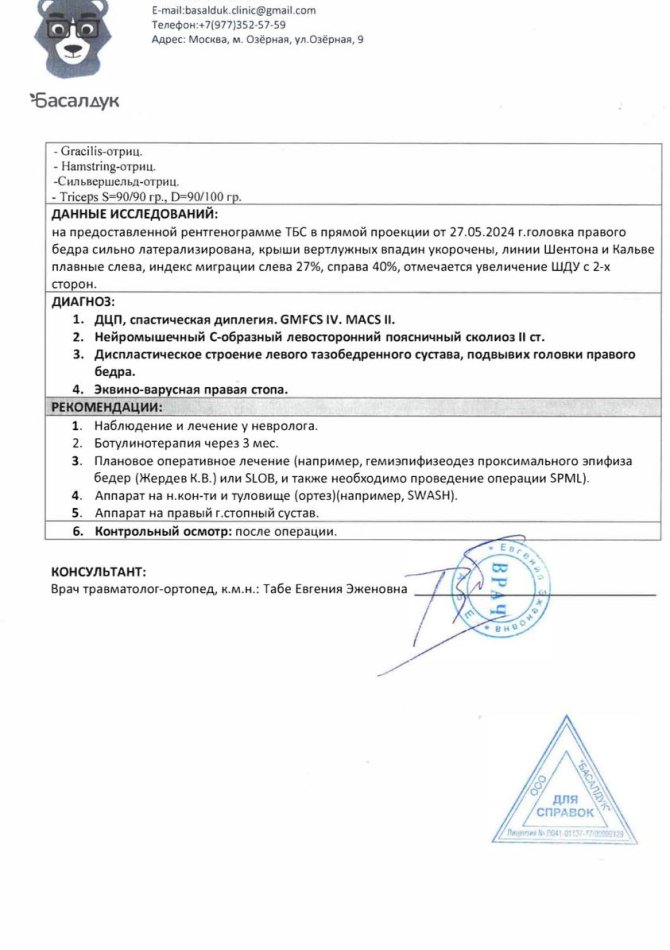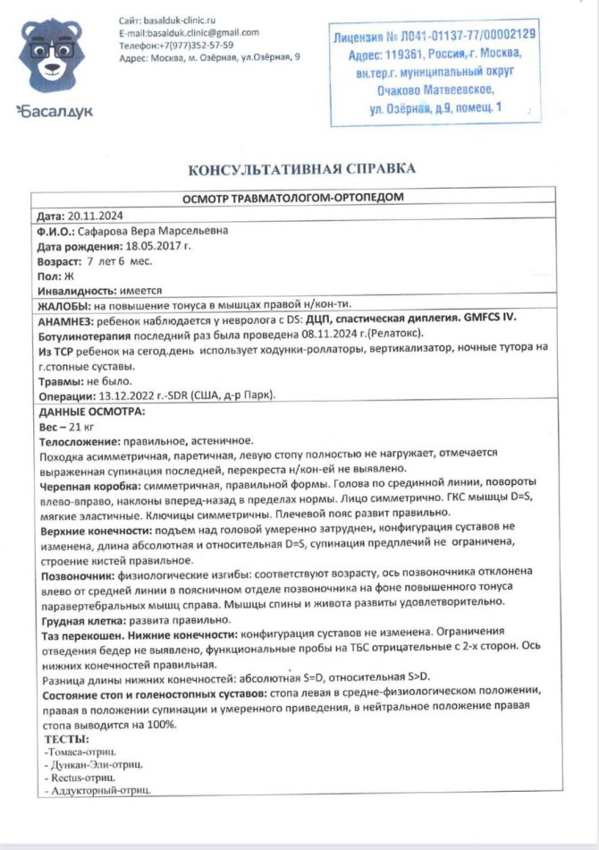 ИСТОРИЯ О МАЛЕНЬКОЙ ДЕВОЧКЕ, ЖИВЕТ НЕСМОТРЯ НИ НА ЧТО. Наша доченька родилась на 32й неделе. Я почувствовала резкую боль слева в животе, и сразу вызвали скорую, приехав в роддом, мне пытались сохранить беременность, кололи уколы, но через два часа отошли воды. Мне сделали кесарево, ребенок родился 6/7 по апгар, ее поместили в реанимацию под ИВЛ. Мне сообщили, что молитесь, что дальше будет неизвестно. Подача кислорода была минимальная, дочка частично дышала сама, но на третий день, что-то пошло не так, врачи хотели снять дочь с ИВЛ, но……. и пришлось повысить кислород до 75%. Потом нас перевели на дохаживание и на 15 день жизни моей Малышки, мне сообщили, что у нас произошло кровоизлияние в мозг и в лучшем случае мы сможем только держать голову, а так…. «Мама откажитесь от ребенка, родите еще». Далее нас перевели в 32 больницу г. Москвы, где кололи кортексин, актовегин и давали цераксон, плюс делали массажи и парафины. Я была в таком состоянии, верила врачам безоговорочно. Как мне сказали позднее, что прием моим ребенком ноотропов повлек за собой появление у нас эпилепсии в шесть месяцев. В шесть месяцев, мы держали голову, игрались с игрушками, почти переворачивались, у нас было гуление и самое важное, что был слух и зрение. На фоне появления эпилепсии мы утратили все навыки и превратились в красивую куклу. За все время нам пришлось многое пройти, мы не жалуемся, у кого-то еще хуже ситуация. Мы идем нашим путем и пытаемся всеми способами помочь Вере. В 2022 году сделали операцию SDR тонус практически ушел, мы постоянно проводим реабилитацию, Вера умеет переворачиваться, ползает попластунски, сидит с поддержкой, может несколько шагов делать в экзоскелете, на ходунках. Разговаривает, понимает обращенную речь, но из-за сильной эпилепсии отстаем от сверстников. Прогнозы по ходьбе при постоянной реабилитации, через пять лет самостоятельная ходьба с ходунками, по логопедии у нас все уже улучшается и специалисты гарантируют правильную речь. Мы наблюдаемся у специалистов и они дают хорошие прогнозы для развития в будущем у Веры. Но сейчас из-за деформации стоп, которая произошла ранее у нас появилось натяжение икроножных мышц, а также ротация колена во внутрь и при ходьбе Вера не может правильно ставить ногу. Мы обратились в клинику PEDIATRIC ORTHOPEDICS, которая находится в США. Доктор НУЗО великолепный специалист в проведении малоинвазивных операций и он нам порекомендовал операцию SPML. Данная операция значительно улучшает физические возможности ребенка. Есть очень много примеров, где после проведения операции улучшается походка ребенка, ребенок с одной категории шкалы оценки ДЦП переходит в другую. Но самое главное, эта операция не имеет аналогов на территории России и у нас есть действующие визы, наличие их облегчает поездку в США. Мы прошли очень сложный путь после операции на спинном мозге и теперь необходимо постоянно заниматься, чтобы закрепить результат после операции. Но если не сделать сейчас операцию SPML, то все труды реабилитологов и наши будут напрасны. Наша доченька для нас самое главное в жизни. Мы ее ждали более девяти лет, она наше счастье и наше будущее. Мы с мужем остались совершенно одни. Близких у нас нет, родители умерли. Помощи нет никакой. Нам приходится постоянно работать, чтобы была возможность оплачивать съемное жилье и оплачивать всевоз