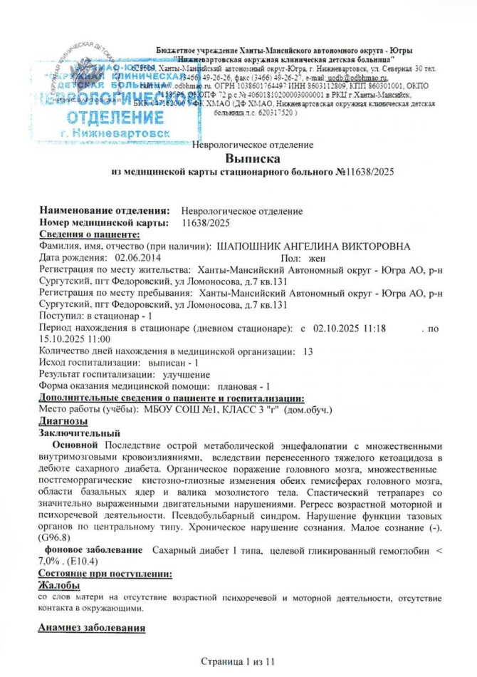 В период новогодних каникул 2023года, в ночь с 5-го на 6-е января, девочке стало плохо, присутствовала тошнота и рвота. К утру стала жаловаться на боли в грудной клетке и затрудненное дыхание. Дочку доставили в приемный покой, где впервые диагностировали высокое содержание сахара в крови (37ммоль/л), положили в реанимацию и ввели в медикаментозную кому, из которой, после отмены препаратов, она не вышла. Побывала Ангелина в трёх реанимациях. В себя не приходила, была угроза жизни, спустя почти месяц выход в вегетативное состояние. В реанимационном отделении Ангелина находилась 2 месяца. В этот период были установлены трахеостома и гастростома. Ребенок ни на что не реагировала, находилась на аппарате ИВЛ, была сильная спастика, образовались контрактуры на левой ступне и левой руке, глазги немного могла приоткрывать. После восстановления всех жизненных показателей дочку перевели в неврологию. Следующие 3 месяца проходили лечение в неврологическом отделении.