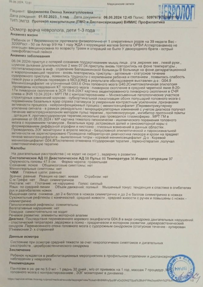 Здравствуйте! Обращаюсь к вам за помощью для моей дочери Омина в реабилитации. Наша дочка с апреля 2024 г заболела, впала в кому и долго лежала в реанимации с диагнозом коревая энцефалита. По Воле Аллаха все тяжёлые дни только начались. К сожалению после реанимации дочка потеряля все навыки, самостоятельно не может ходить, сидеть, разговаривать и не держит головку. Моя дочка до заболевания ходила, разговаривала, все умела она было маленькая но было очень умная, в 11 месяцев ходила, бегала. Но после 1,2 месяц она заболела, все разрушилось, она как инвалид лежит. Я умоляю Вас о помощи моей маленькой девочки. Очень хочется все начать сначала, но она сама не может. Врач невролог назначил для восстановление проходить несколько курсов реабилитации, к сожаление мы не смогли собрать деньги. помогите пожалуйста ???? в нашей семье работает только муж, живем на съемной квартире мы сами своими силами не смогли, помогите пожалуйста???? не отказывайте пожалуйста, нам очень важно пройти эти 3 курса.