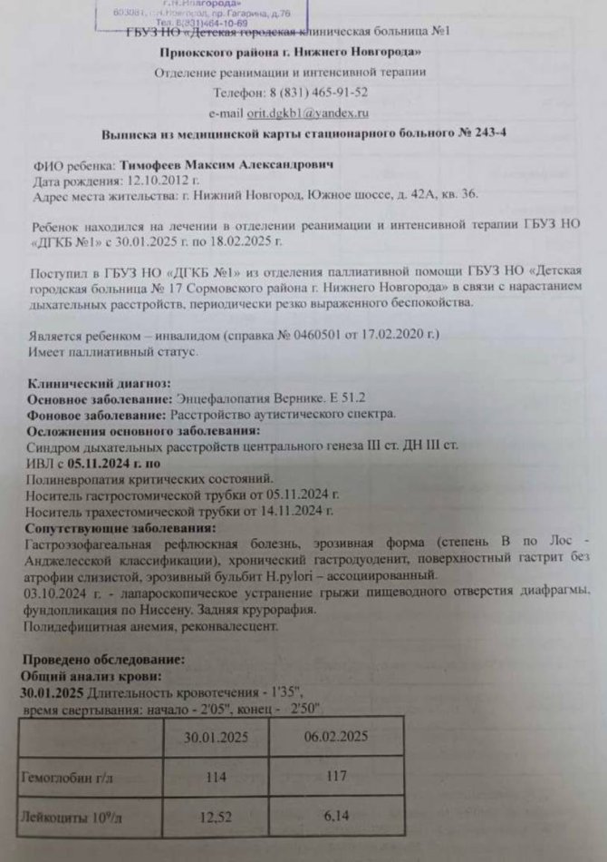 17 декабря на врачебном консилиуме было принято решение о необходимости направления Максима на паллиативную помощь, критическое жизнеугрожающее состояние ребенка.